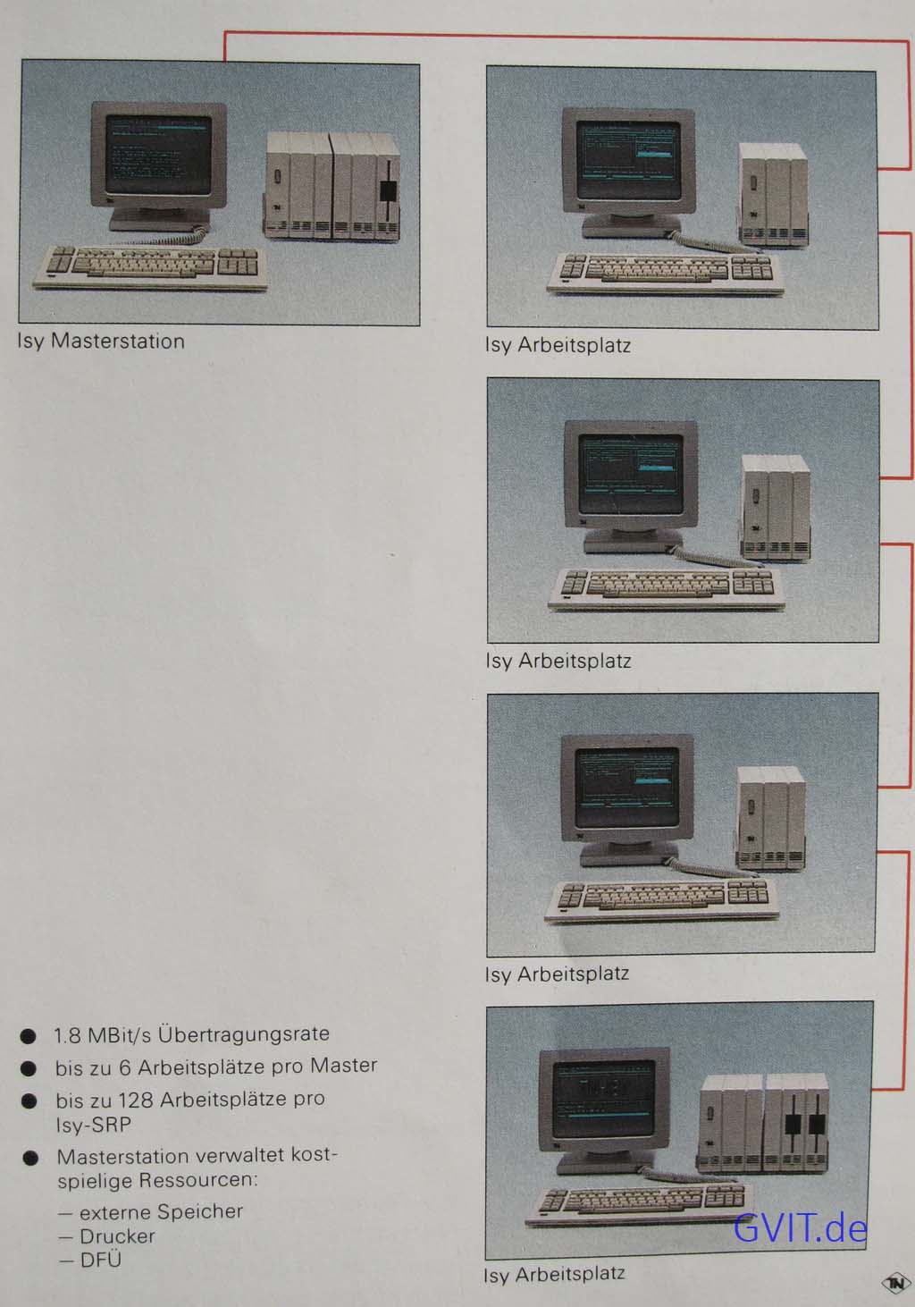 Der Master umfasst - je nach Kapazitätsbedarf - ein Rechnermodul mit bis zu 1 MB Speicher und Massenspeichermodule mit einer Kapazität von bis zu 160 MB. Die an den Master angeschlossenen Arbeitsplätze bestehen aus dem Rechnermodul das sich - je nach Anwendung - in Schritten von jeweils 256 KB bis zum 1 MB-Speicher ausstatten läßt. Daneben steht jedem Arbeitsplatz die volle Massenspeicherkapazität des Masters zur Verfügung. Darüber hinaus kann der am Master installierte Drucker auch als System-Drucker konfiguriert sein. Ein Spooling-Verfahren erlaubt jedem Arbeitsplatz den Zugriff auf den Drucker, so als wäre er direkt am AP angeschlossen. Die Arbeitsplätze sind im Multidrop-Verfahren über die RS 422-Leitung mit dem Master verbunden. Die Übertragungsgeschwindigkeit auf dieser Leitung beträgt 1,8 MB/s. Der organisatorische Aufbau der Isy-Systemfamilie macht es möglich, die am Master installierten Ressourcen auch von den angeschlossenen Arbeitsplätzen genutzt werden können. Dadurch wird eine erhebliche Reduzierung der Arbeitsplatzkosten erreicht, ohne daß der Anwender auf die an den einzelnen AP benötigte Leistungsfähigkeit verzichten muß (Abb.12).
