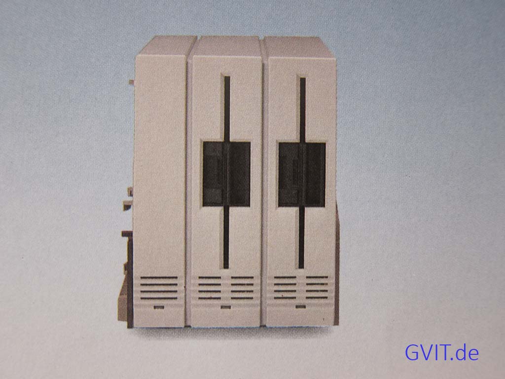 Bildschirm, Tastatur und Rechnermodul bilden somit die Basis-Konfiguration eines multifunktionalen Arbeitsplatzes, der sich - entsprechend der jeweiligen Anforderungen - um weitere Module ergänzen läßt. Der besondere Clou ist dabei die Technik, mit der sich diese Ergänzungen durchführen lassen: Das Rechner-Modul (Abb.4) hat auf der rechten Seite eine offene Steckerleiste mit 120 Anschlüssen, an die das jeweils nächste Modul einfach angesteckt wird: völlig ohne Kabel (X-Bus)! Der Verschlussmechanismus sorgt für eine einwandfreie und funktionelle Verbindung zwischen Buchse und Stecker.