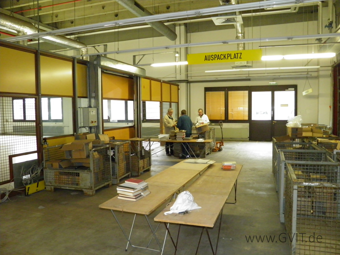 Nach jahrelangem Aufenthalt in Laubus-Eschbach, dann in Backnang, haben jetzt die restlichen Bücher der Technischen Bibliothek von TN wieder in der Kleyerstraße ihren Platz gefunden. In der leeren Halle G gesichtet und in den Archivraum verschafft, warten die historischen Bücher dort seit Januar 2012 auf ihre Weiterverwendung.