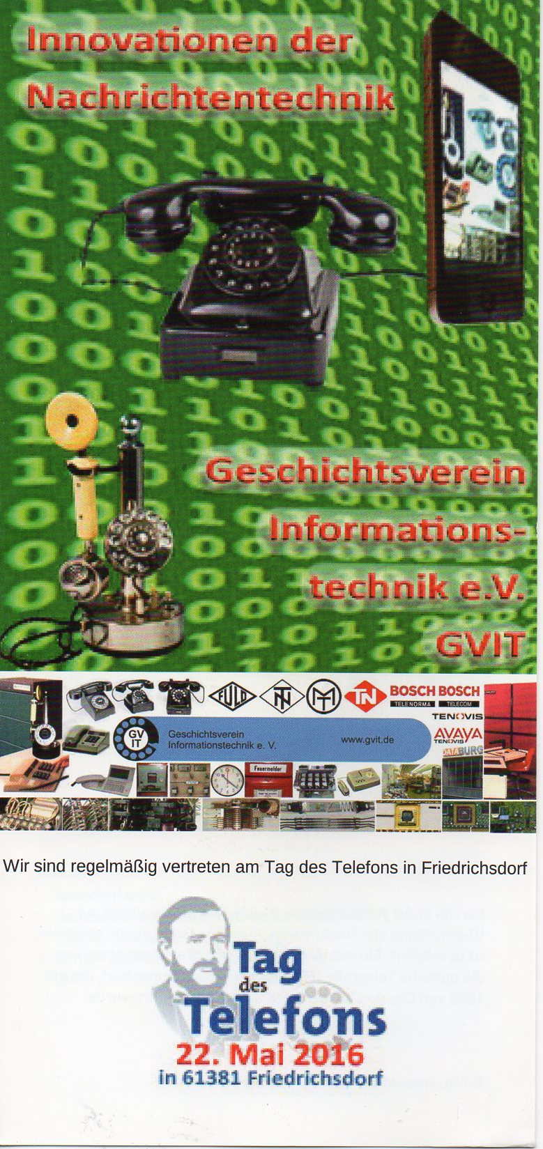 Unsere Internetseite http://www.gvit.de wird von ein paar Vereinsmitgliedern gepflegt. Sie berichten dort über Innovationen der Informationstechnik mit Schwerpunkt der Geschichte der TN und ist eine Erinnerung an Harry Fuld und Telefonbau und Normalzeit. Die Internetseite soll ein Portal für ehemalige Kollegen sein und mit Links und beschreibendem Text in die Tiefe dieser unserer Datensammlung führen. |