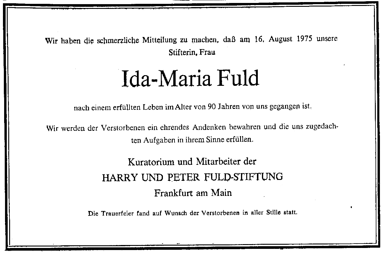 Ida Maria Fuld geb. Felsmann war die 2. Ehefau von Harry Fuld und die Mutter von Peter Fuld.