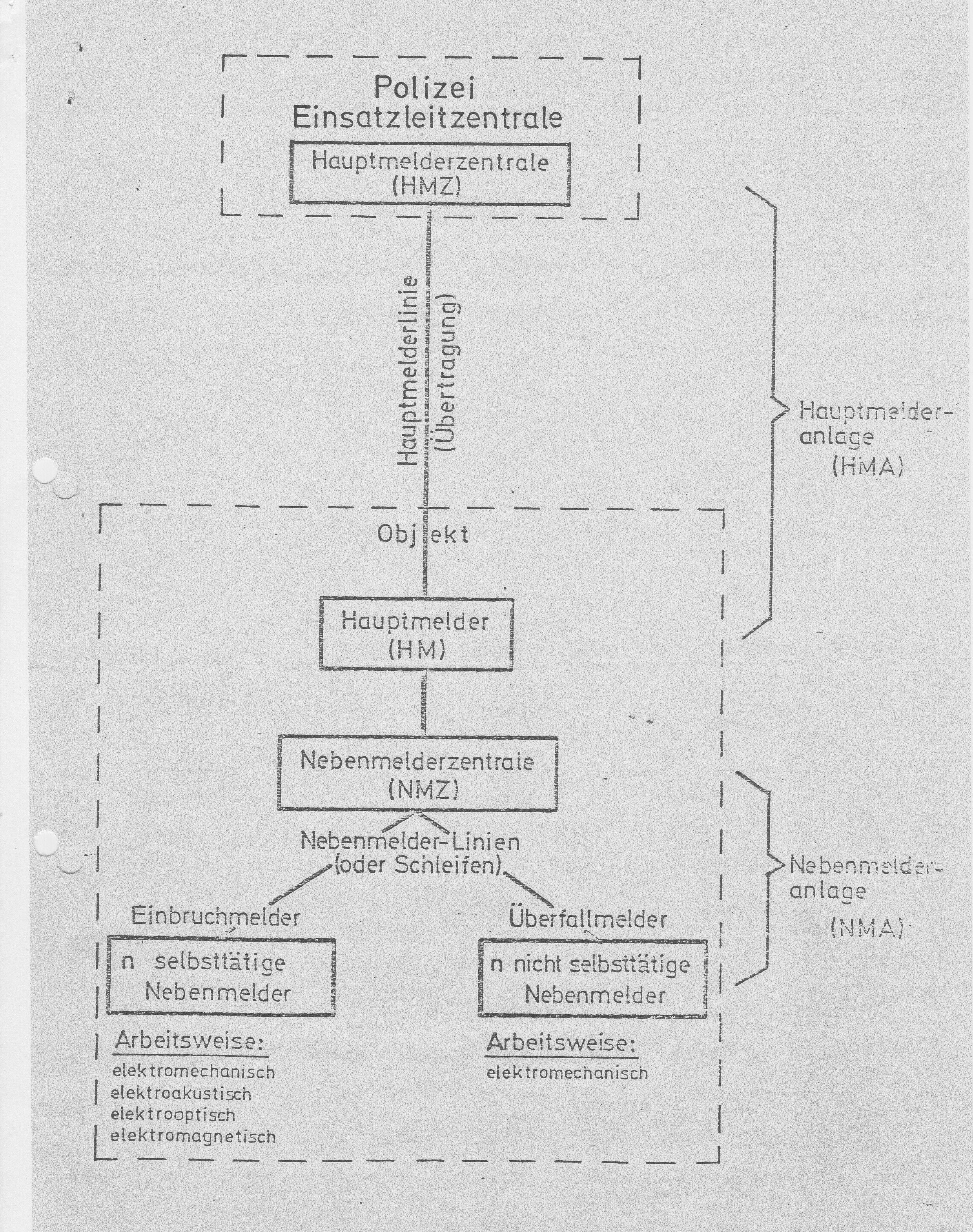 Nachfolgende historische Darstellung zeigt das Prinzip einer Hauptmelderanlage Notruf (veröffentlicht durch die Pressestelle der Polizei Frankfurt am 28.09.1978):