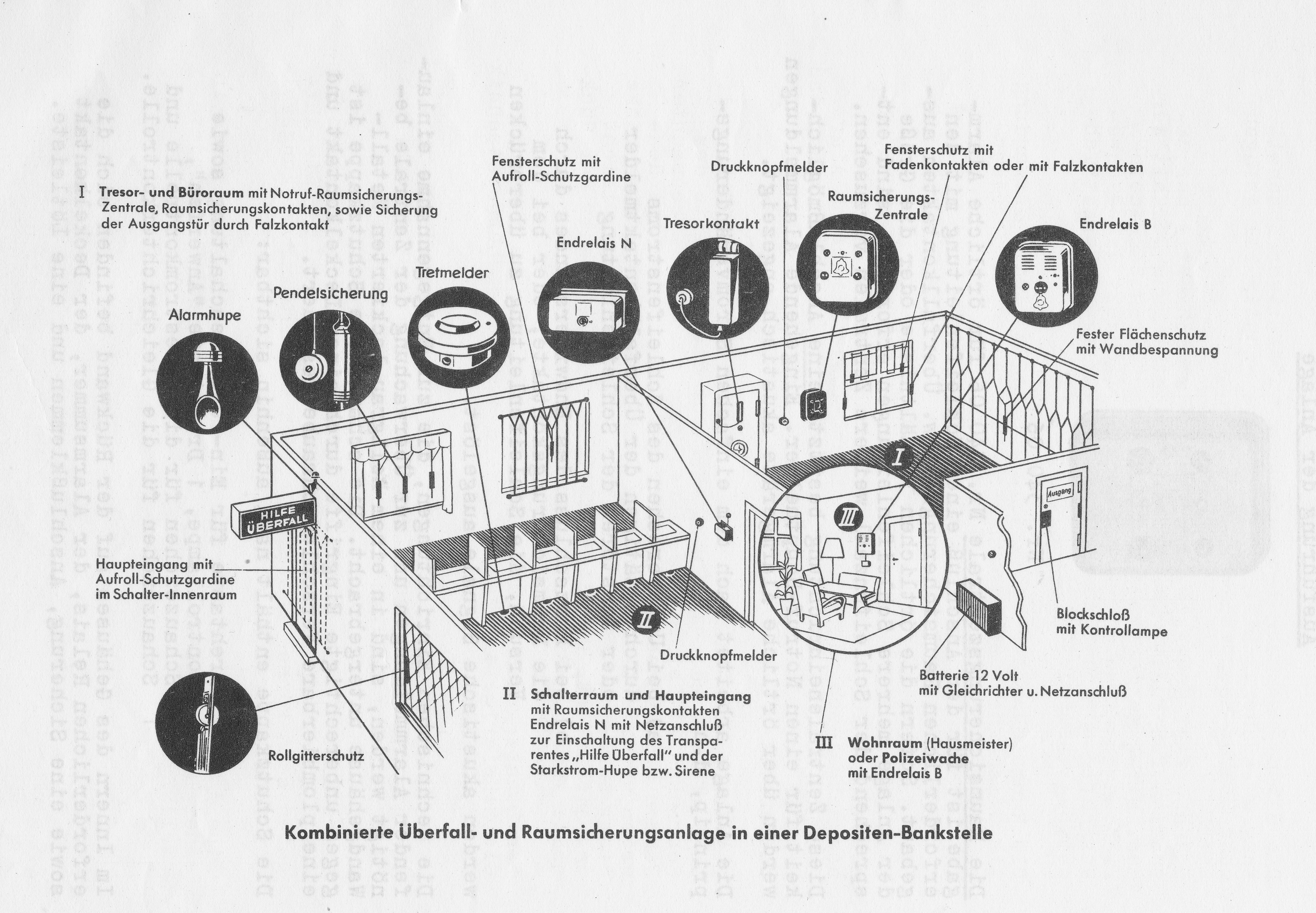 Eine typische und regelkonforme Anordnung von Notruf- und Raumsicherungskontakten in einer Depositenkasse (Bankfiliale) zeigt die nachstehende Prinzipdarstellung aus 1957: