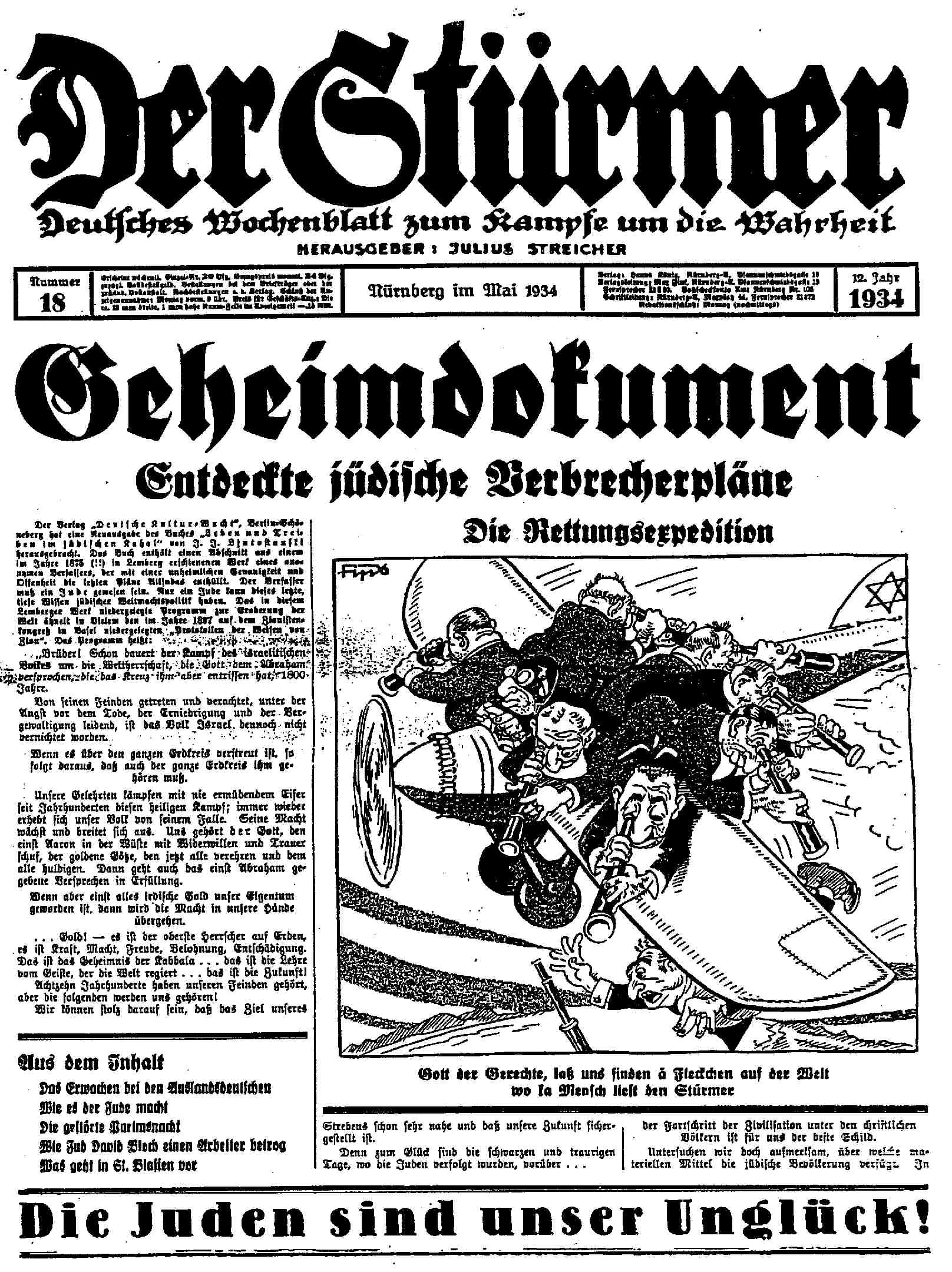 Der Stürmer, ab 1932 mit dem Untertitel „Deutsches Wochenblatt zum Kampfe um die Wahrheit“, war eine am 20. April 1923 vom NSDAP-Gauleiter von Franken Julius Streicher in Nürnberg gegründete und herausgegebene antisemitische Wochenzeitung. Sie erschien am 22. Februar 1945 letztmals. Der Stürmer bediente sich einer besonders hetzerischen Sprache und zeichnete sich durch drastische – bei Schilderungen von „Rassendelikten“ pornographische – Berichte, Bilder und Karikaturen aus. Die Zeitung war keine offizielle NS-Publikation, sondern Streichers Privatbesitz. Der Internationale Militärgerichtshof schätzte die Auflagenhöhe zwischen 1935 und 1939 auf 700.000 Exemplare, die Sondernummern zu den Reichsparteitagen auf mindestens zwei Millionen Stück. Das Blatt diente der propagandistischen Vorbereitung und Begründung des Holocaust.