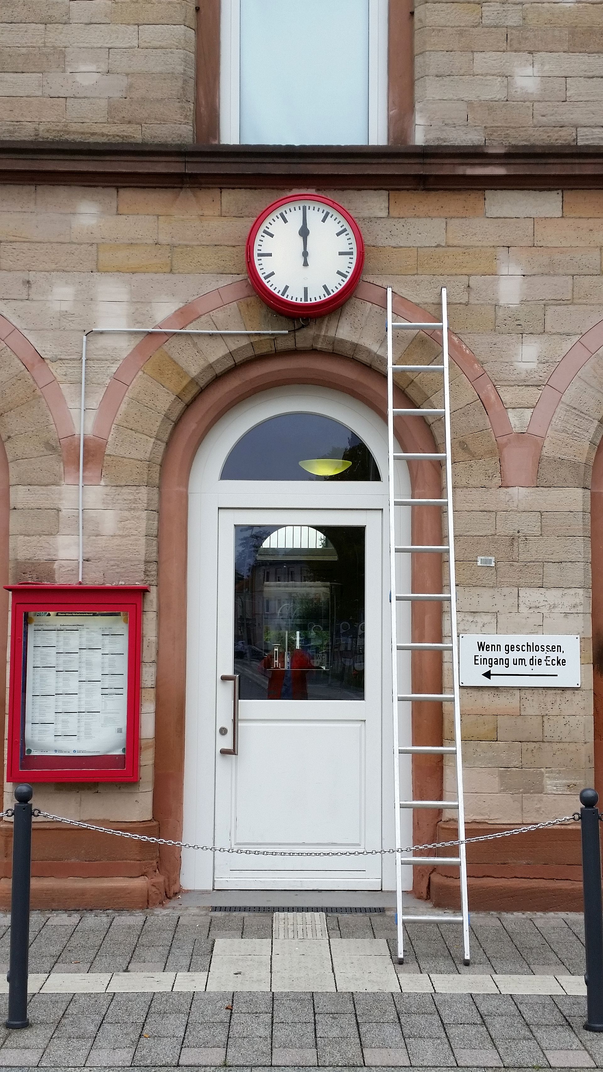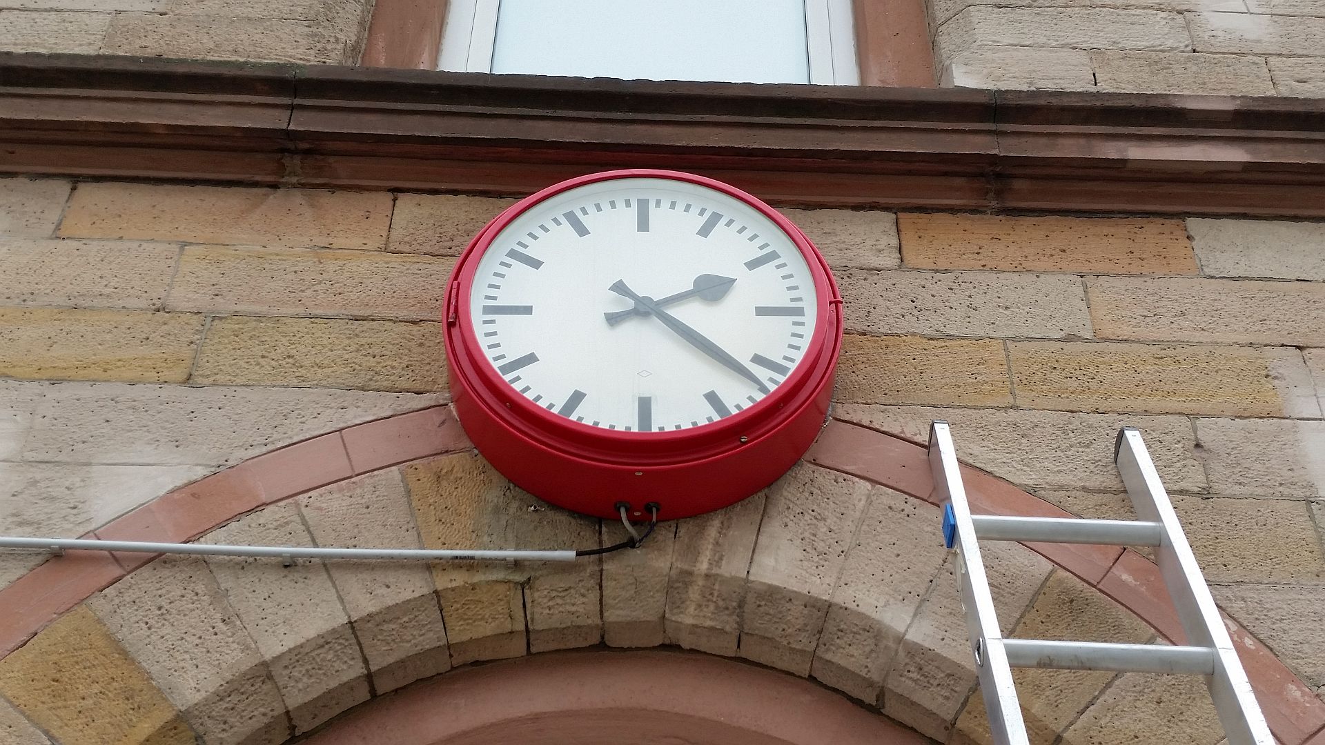 Davor wurde als erstes Projekt von Sept. - Nov. 2015 die Restauration der Bahnhofsuhr am Vorplatz des Bf.Babenhausen (Hessen) durchgeführt. Die sehr in Mitleidenschaft gezogene Uhr, wurde entkernt, abgeschliffen und neu Lackiert, Elektronik soweit wie möglich neu, und die Uhrentechnik so übernommen wie vorhanden. Bei dieser Uhr gibt es lediglich die kleine TN-Raute ohne Inhalt. Die Uhr ist nun betriebsfähig erhalten und am Empfangsgebäude des Bf.Babenhausen (Hessen) zu sehen.