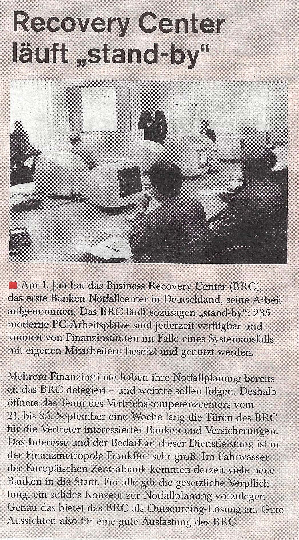 Recovery Center" - eine hochverfügbare Ausweichlösung für die hiesige Finanzwelt mit mehr als 200 Händler-Arbeitsplätzen. Beim Auftreten eines Störfalles im Datensystem der Kundenbank ist die Wiederaufnahme der Arbeitsfähigkeit innerhalb von vier Stunden garantiert. Kein Wunder, dass viele Frankfurter Banken längst zum Kundenkreis des Unternehmens zählen. Zehn Bandbreiten-Dienstleister - vom City-Carrier bis zum internationalen Blue Chip vertrauen ebenfalls auf die Tenovis Databurg. Im Bereich ISP und ASP bauen die ersten wichtigen Anbieter dieser zukunftsträchtigen Technologien bereits Plattformen dort auf. "Zu den Namen all dieser Kunden können wir nichts sagen", so Peter Hirschmann, Leiter der Tenovis Databurg. "Diskretion ist in diesem Geschäft oberstes Gebot".
