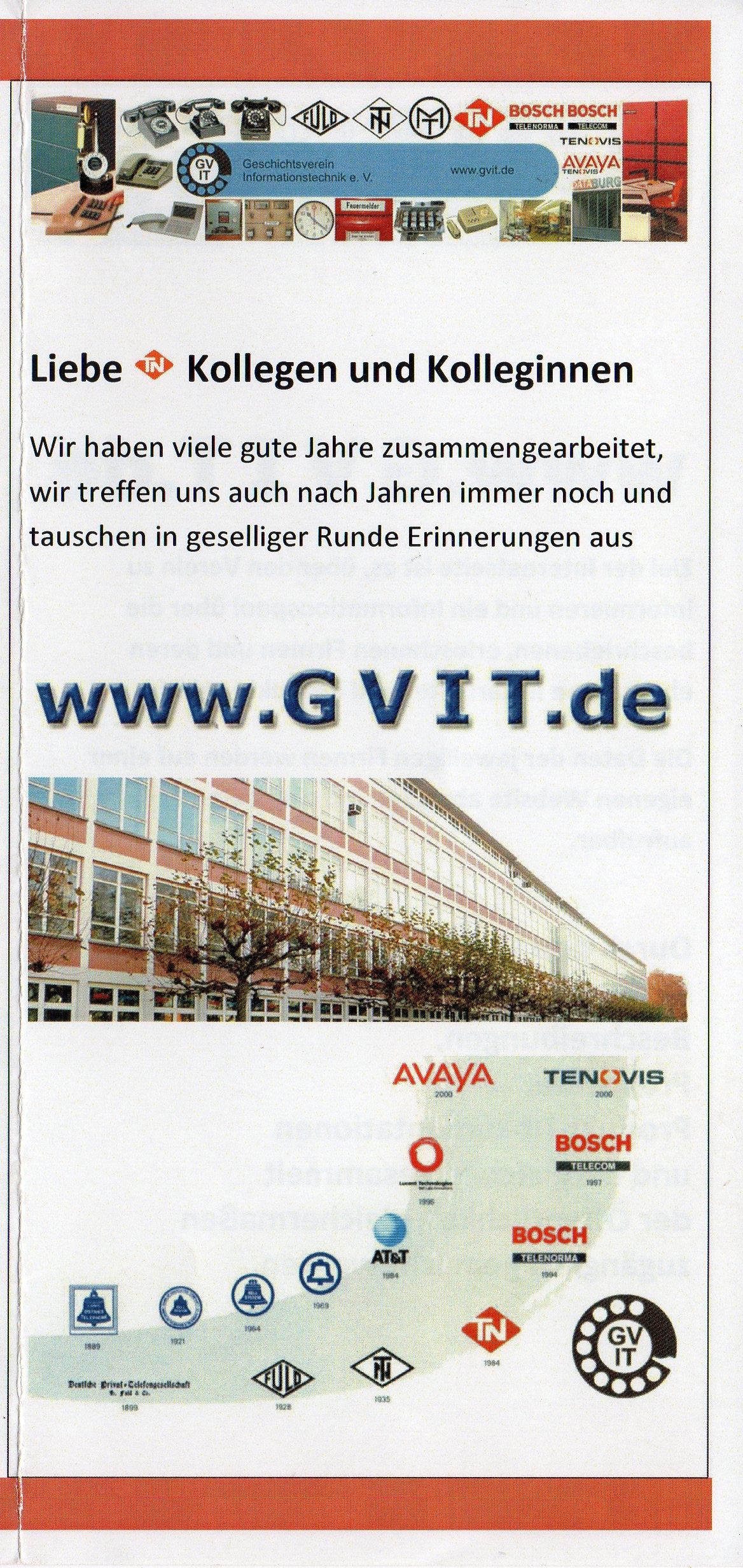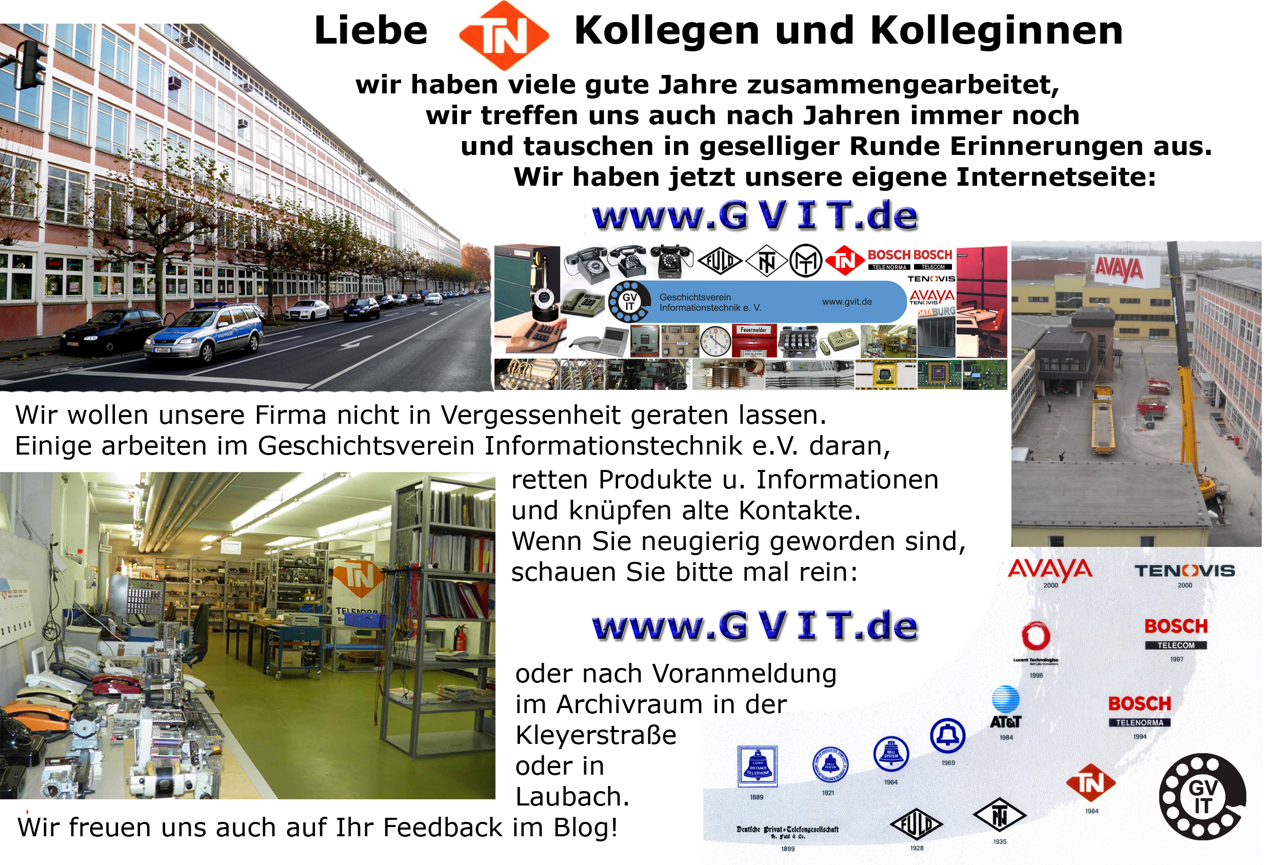 Unsere Internetseite http://www.gvit.de wird von ein paar Vereinsmitgliedern gepflegt. Sie berichten dort über Innovationen der Informationstechnik mit Schwerpunkt der Geschichte der TN und ist eine Erinnerung an Harry Fuld und Telefonbau und Normalzeit. Die Internetseite soll ein Portal für ehemalige Kollegen sein und mit Links und beschreibendem Text in die Tiefe dieser unserer Datensammlung führen. |