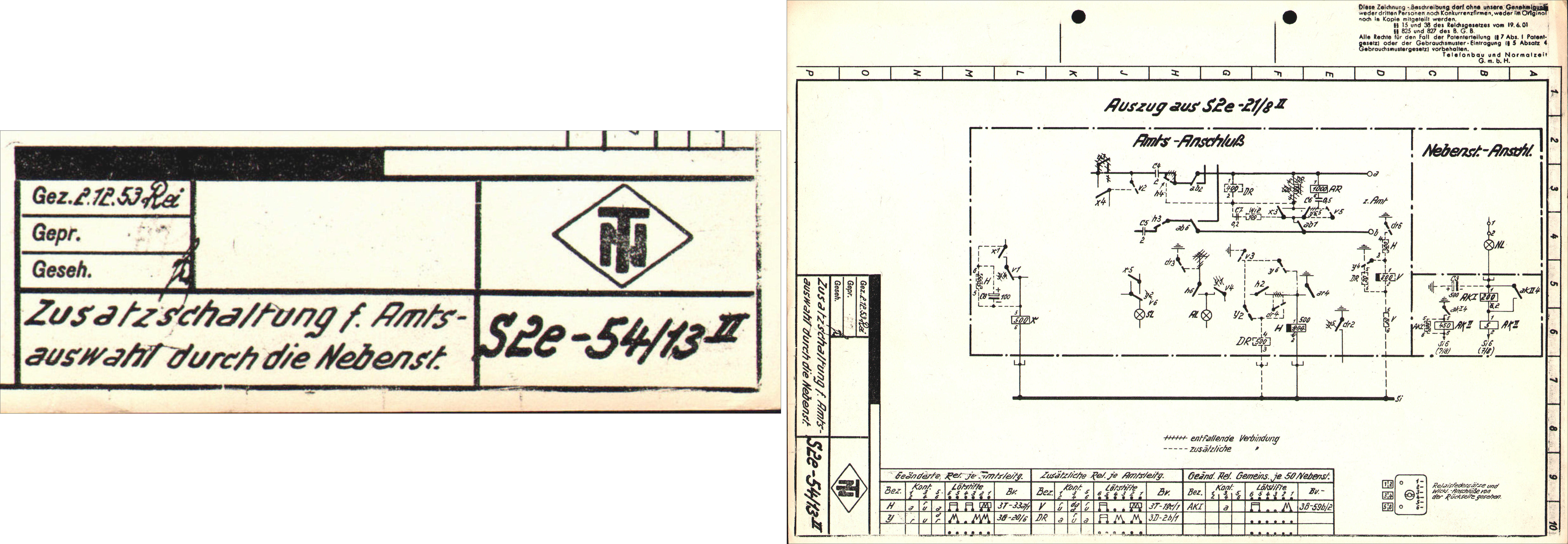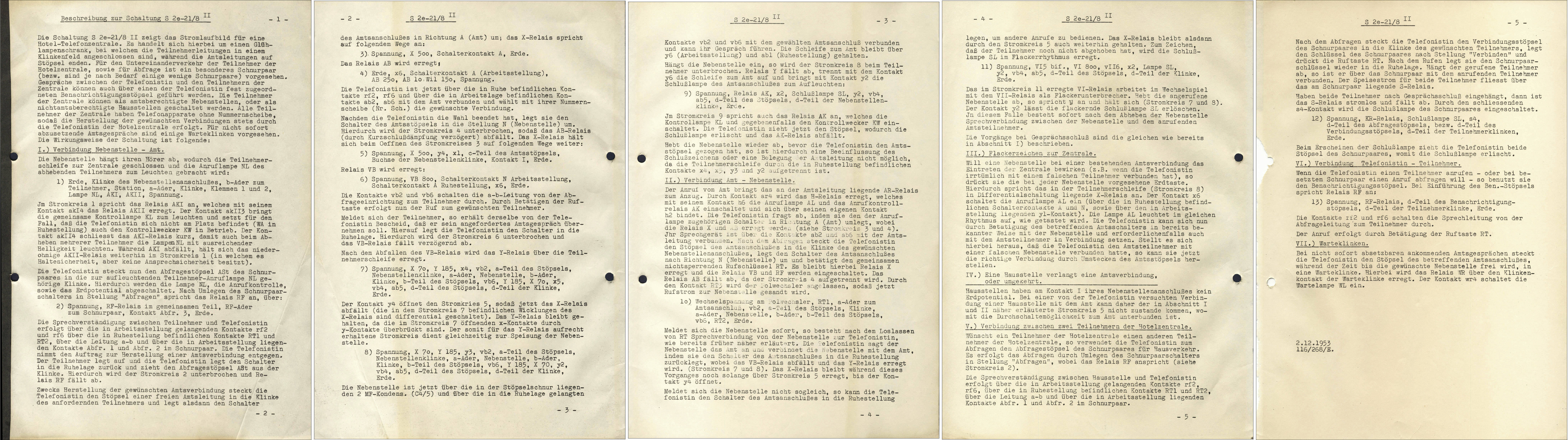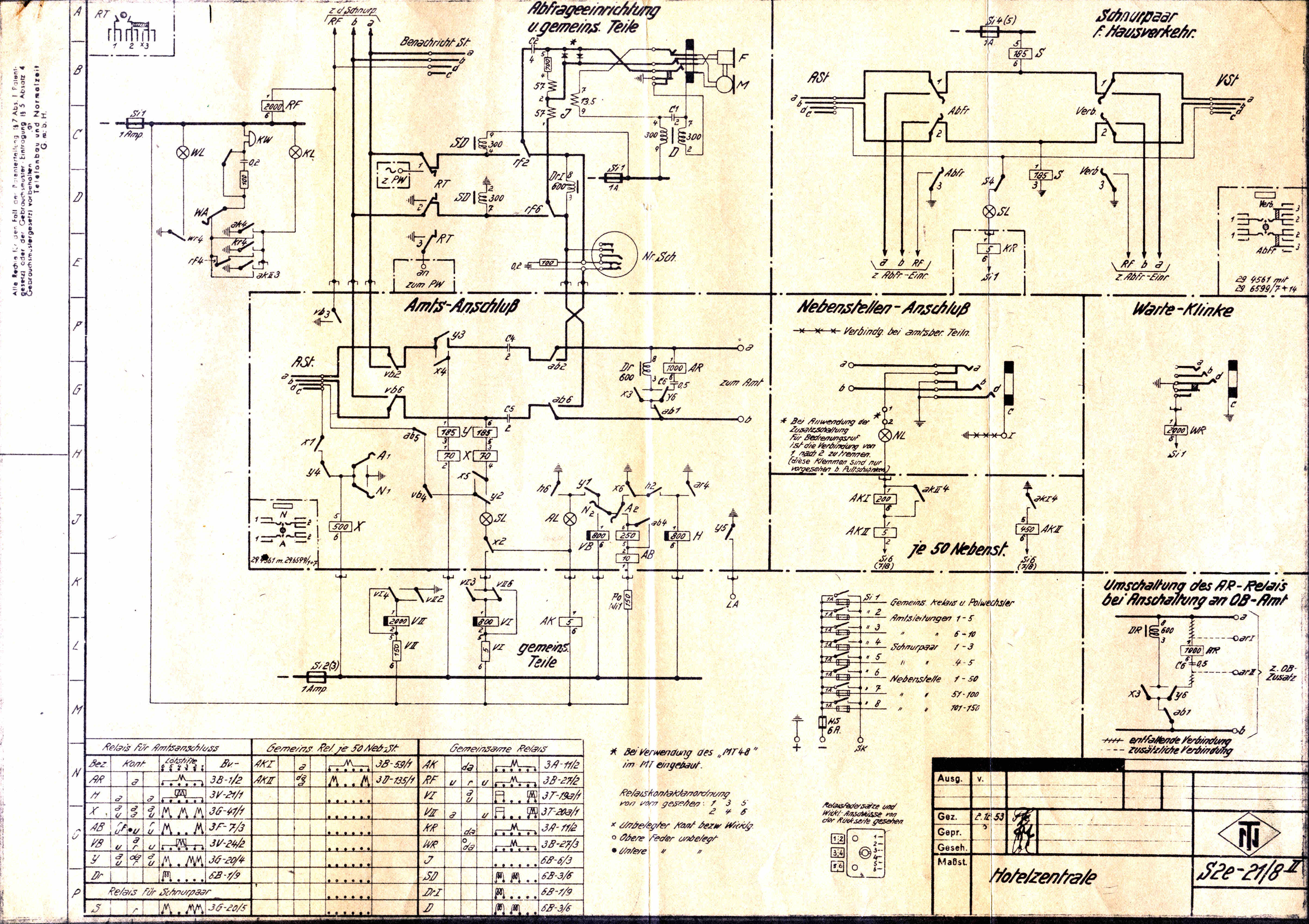 | Schnurvermittlungstechnik Hotelzentrale nach Schaltung S2e-21/8 Nebenstellenanlage mit Glühlampen-Anrufzeichen für 40 Nebenstellen ZB- (Zentralbatteriebetrieb) / W- (Wähl) Betrieb 3 Amtsleitungen (Einschnursystem) 2 Innenverbindungs-Schnurpaare 1 Benachrichtigungsstöpsel Abfrage- und Vermittlungsschnüre mit Aufrollvorrichtung Vermittlungsfunktionen speziell für Hotel-Anlagen ☞☎) ausgelegt Keine Mithörmöglichkeit Selbsttätige Hotel-Weckruf-Einrichtung Nachtschaltung Nebenstellenruf mit Relais-Polwechsler Amtsleitungen mit eingebauten 16-kHz-Gebührenimpulszählern Wecker auf Langsamschläger (25 Hz) umgebaut Kein Haken für Handapparat |