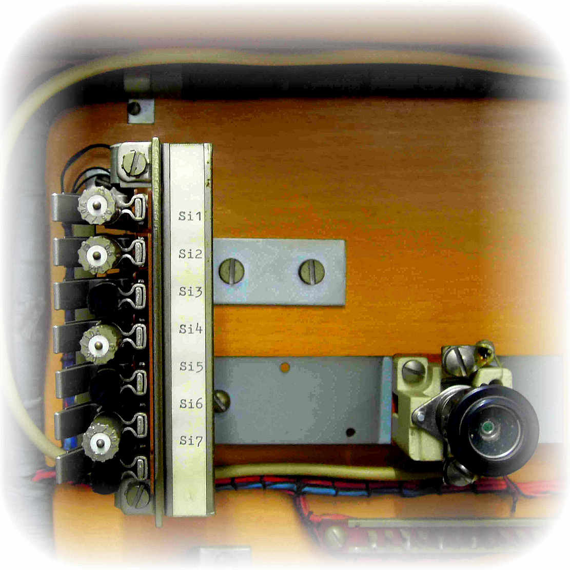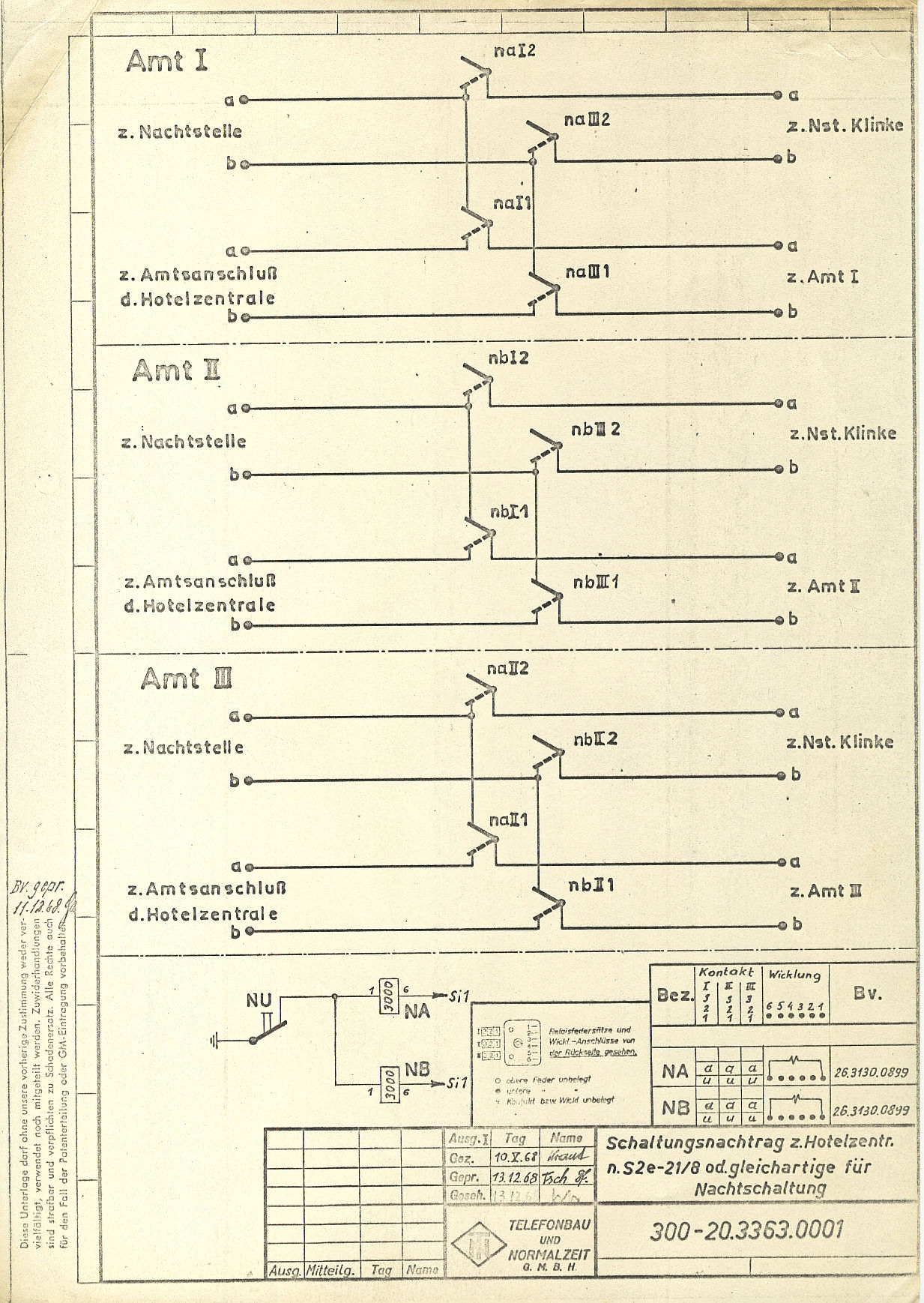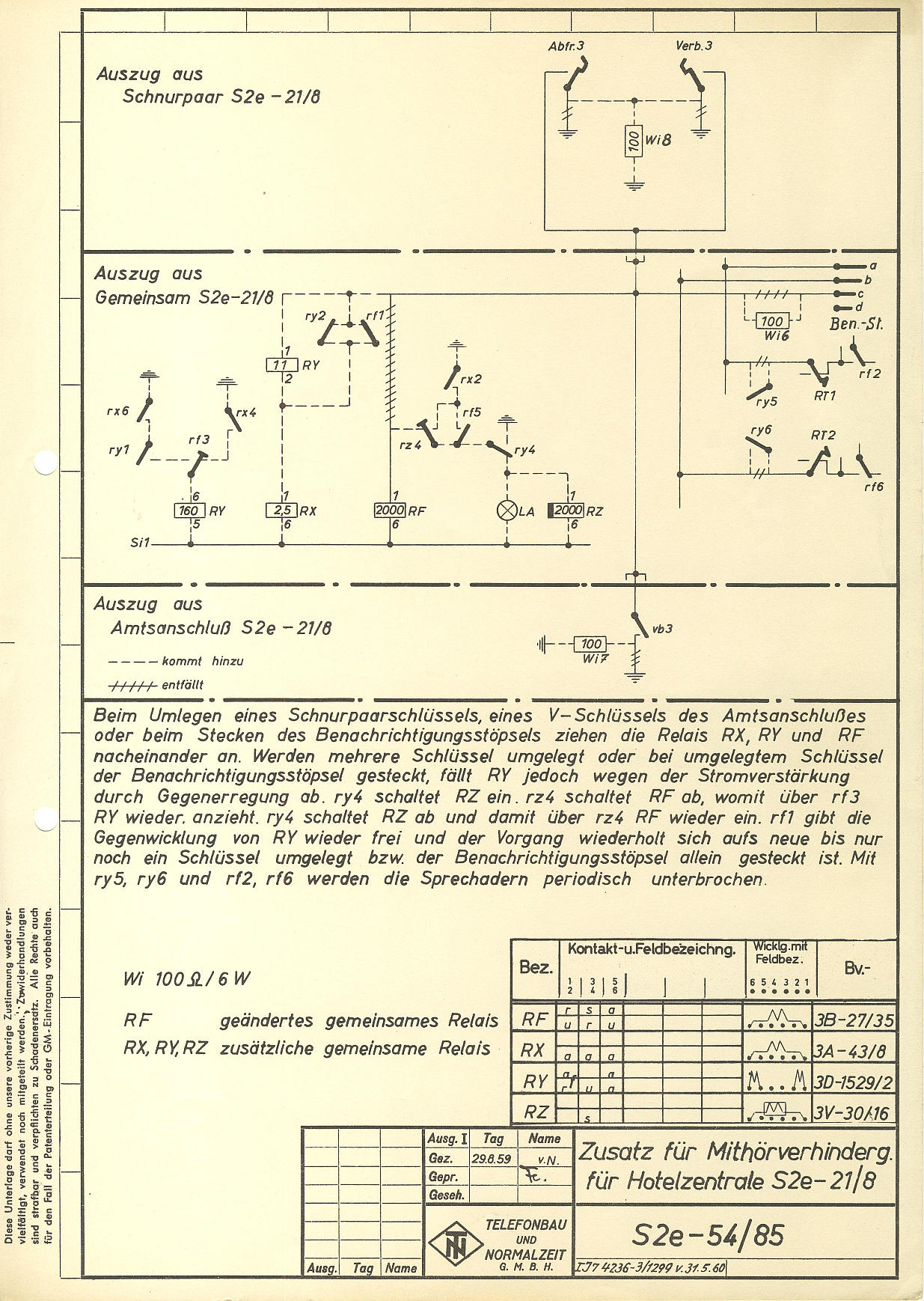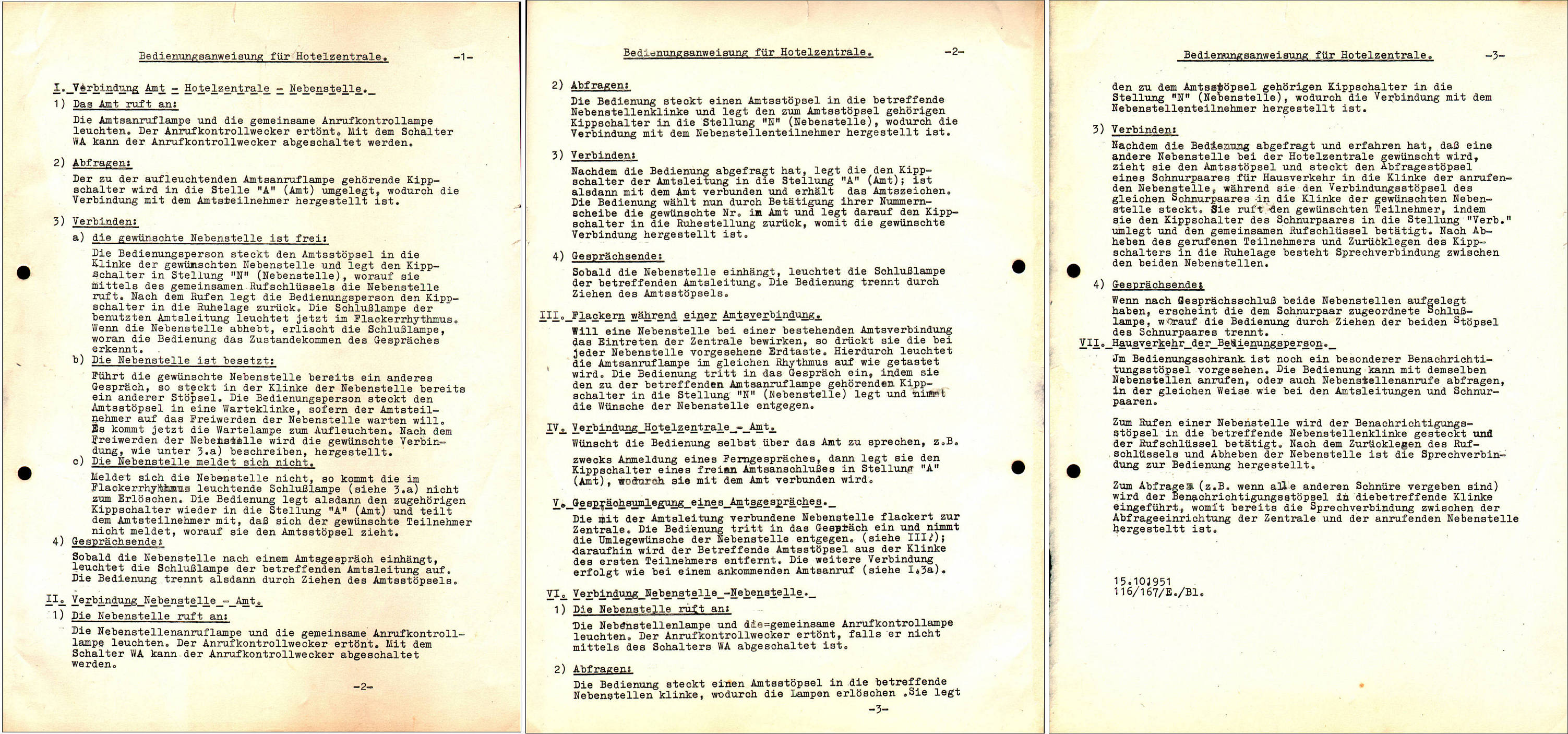 | Schnurvermittlungstechnik Hotelzentrale nach Schaltung S2e-21/8 Nebenstellenanlage mit Glühlampen-Anrufzeichen für 40 Nebenstellen ZB- (Zentralbatteriebetrieb) / W- (Wähl) Betrieb 3 Amtsleitungen (Einschnursystem) 2 Innenverbindungs-Schnurpaare 1 Benachrichtigungsstöpsel Abfrage- und Vermittlungsschnüre mit Aufrollvorrichtung Vermittlungsfunktionen speziell für Hotel-Anlagen ☞☎) ausgelegt Keine Mithörmöglichkeit Selbsttätige Hotel-Weckruf-Einrichtung Nachtschaltung Nebenstellenruf mit Relais-Polwechsler Amtsleitungen mit eingebauten 16-kHz-Gebührenimpulszählern Wecker auf Langsamschläger (25 Hz) umgebaut Kein Haken für Handapparat |