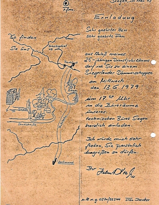 Mit dem Ereignis, dass das techn. Büro Siegen ein neues Domizil erhält, bestand der Wunsch in Gemeinsamkeit mit allen Belegschaftsmitgliedern des TB und der Geschäftsleitung des VB,s die Einweihung in Form einer kleinen Feier zu begehen.