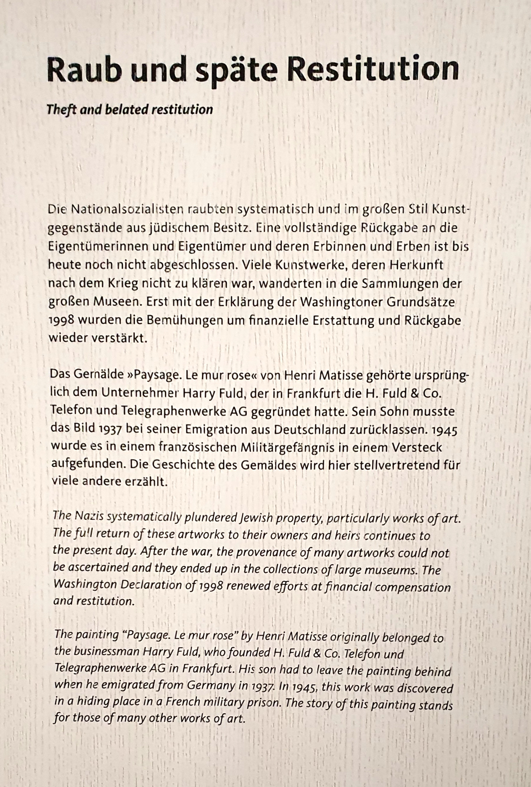 Dieses Landschafts-Gemälde, das Matisse 1868 auf Öl mit dem Titel Korsika malte, hatte 1917 Harry Fuld für seine umfangreiche Kunstsammlung erworben und seinem Sohn Peter Fuld vererbt. Mit vielen anderen Kunstgegenständen war es als Raubkunst der Nazis jahrzehntelang verschollen. 2010 konnte es schließlich vom Museum erworben werden. Die wechselvolle Geschichte der Rückgabe lesen Sie auf nachfolgenden Bildern.